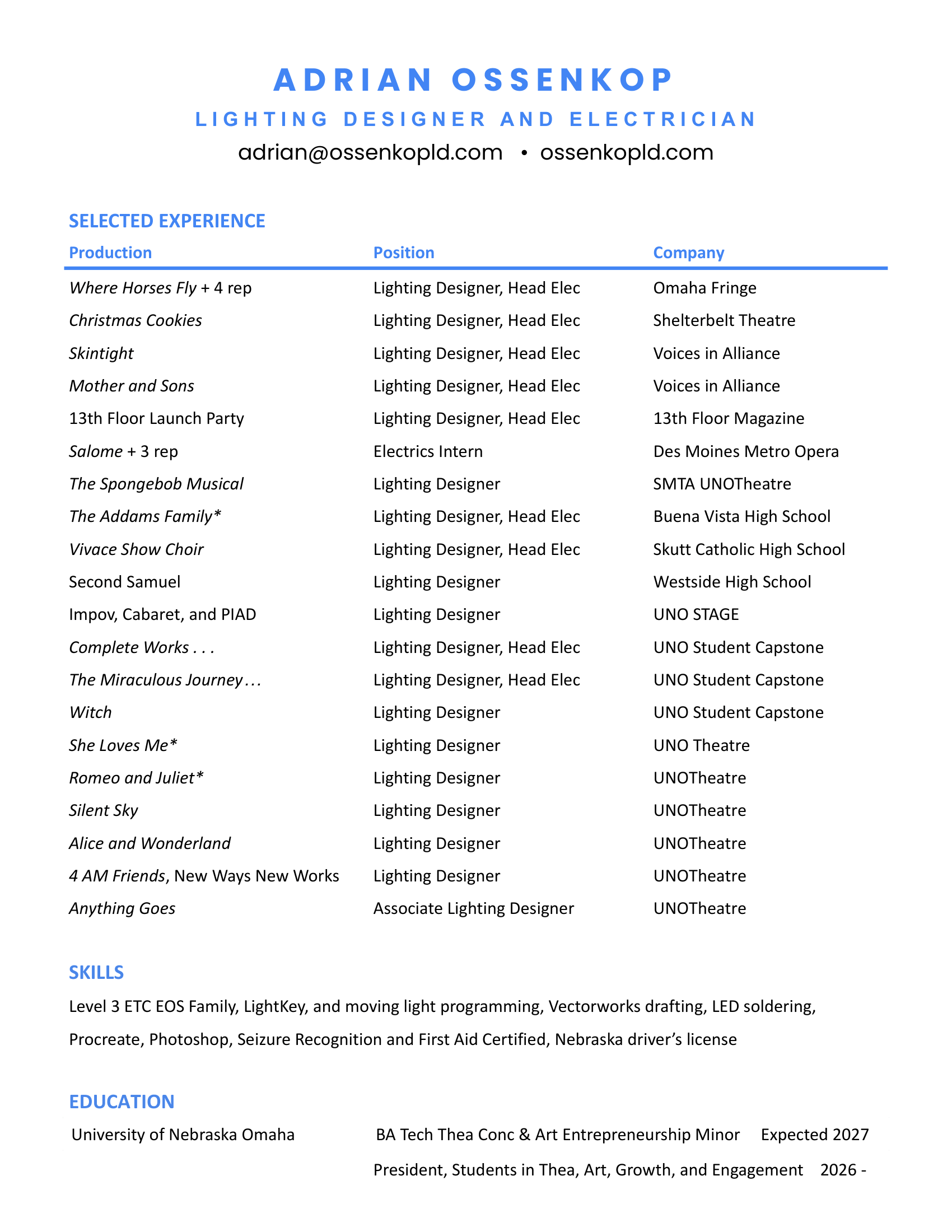 Adrian Ossenkop is a lighting designer based in Omaha, Nebraska, and a junior at the University of Nebraska at Omaha, where he studies theatre with a focus in lighting design.
